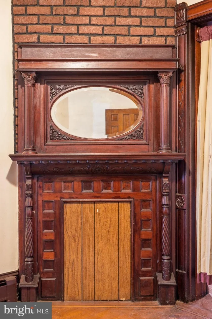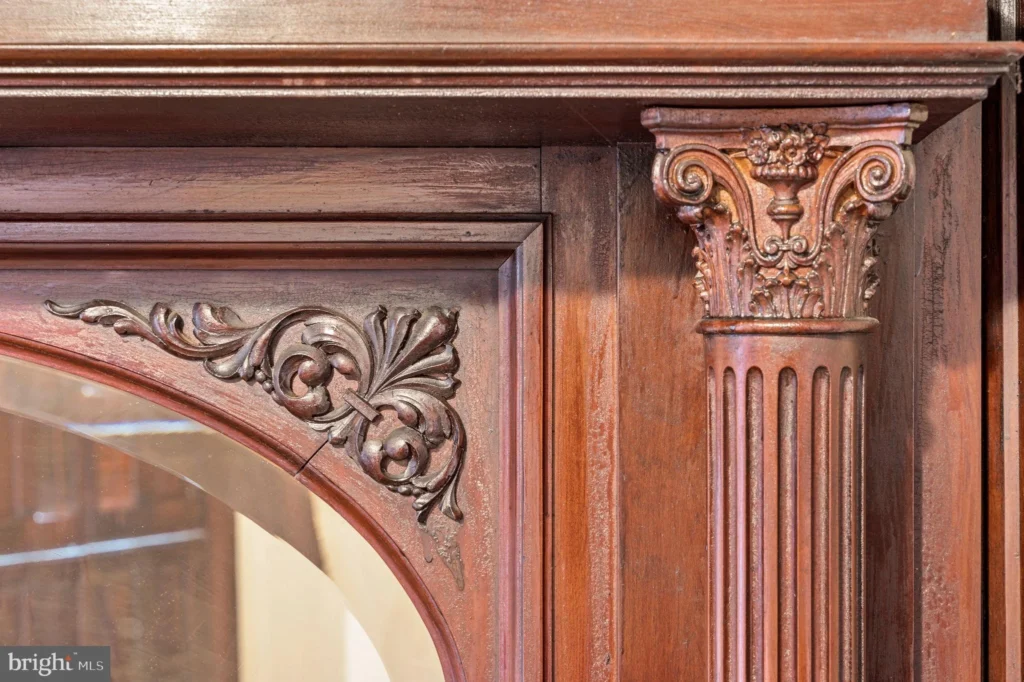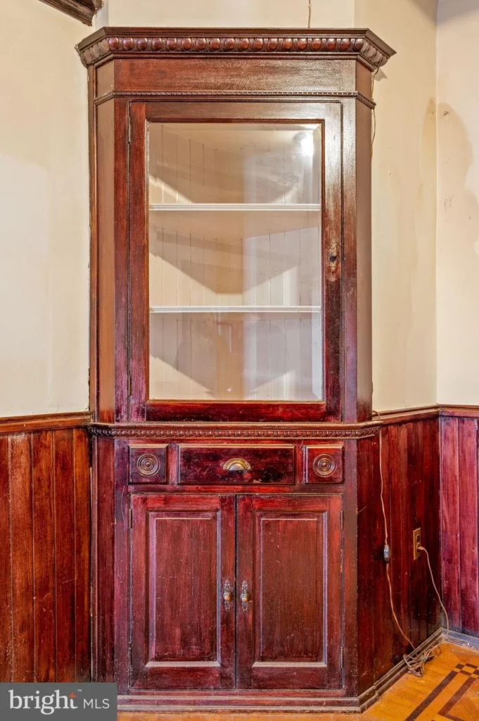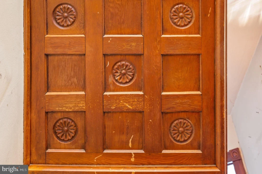 Interior finishes offered by this property signify craftsmanship of a time gone by with solid wood curved doors, interior doors with glass transoms above, handcrafted interior wood window shutters stained glass, wood paneling, ornate carved ornamental oak stairs, varied base and trim moldings, inlay and herringbone accented hardwood flooring, a former fireplace with custom mantel, period hardware, and high interior ceilings each of accent the architectural elements on this property.