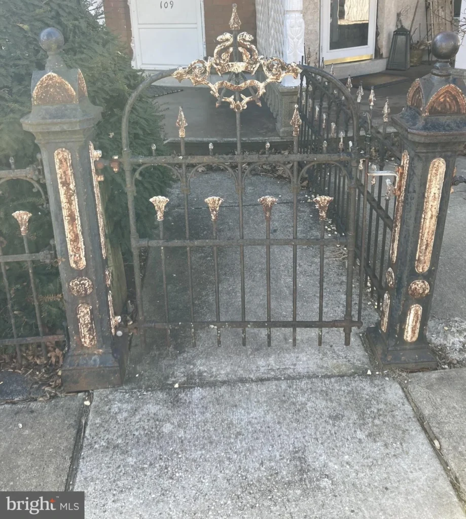 From 2nd Avenue there is an ornate iron fence and gate entry to an open front porch. You enter the home via a solid “curved” wood door to an enclosed entry.