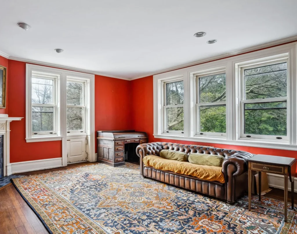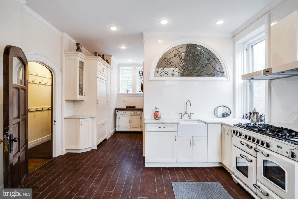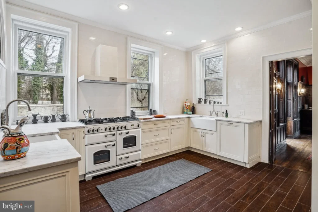 The adjacent formal dining room is the perfect setting for hosting dinner parties and holiday meals. Two large multi-pane windows illuminate intricate Elizabethan strapwork on the ceiling and beautiful hand-carved details on the fireplace mantle. The sun-splashed chef’s kitchen is equipped with a professional 8-burner gas range and fitted with custom wood cabinetry, honed marble countertops, and a pair of gleaming farmhouse sinks with classic Georgian-era bridge faucets.