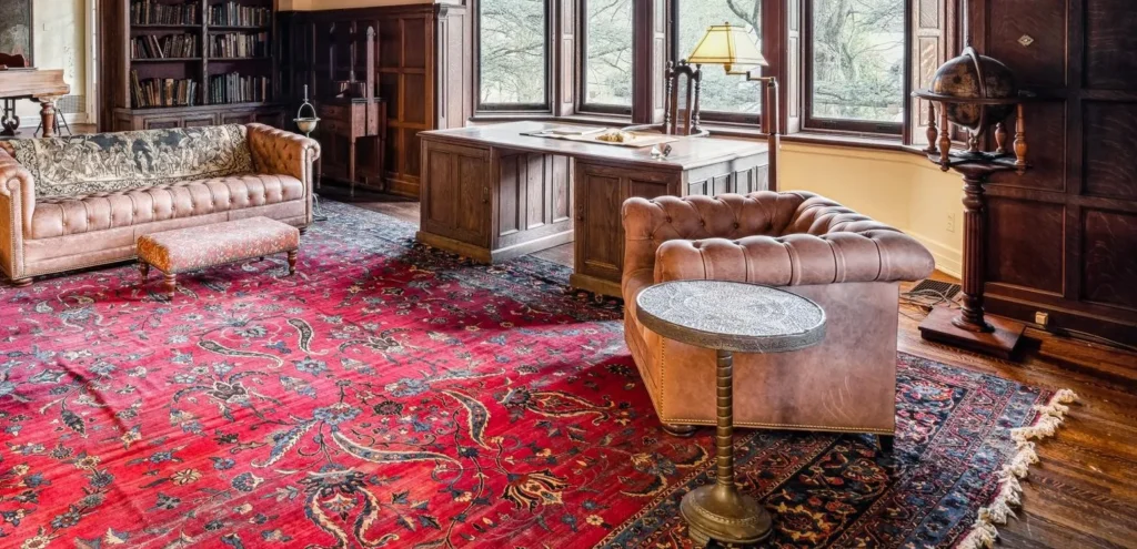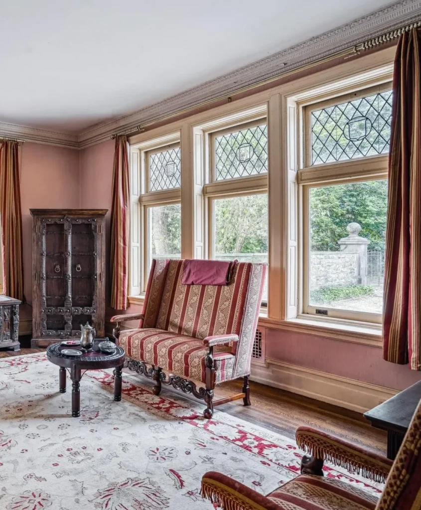 Enter the home’s grand foyer through a hand-hewn oak door and unique vaulted vestibule. The exquisite, double-height main hall centers on a dramatic oak panelled staircase and a large stone fireplace with a decorative wood surround. Handsome oak wainscoting is punctuated by several Tudor-arch openings that adjoin the sitting room, music room, and kitchen. To the left, sunlight illuminates the bijou formal sitting room with an elegant Florentine fireplace and ornate crown mouldings.