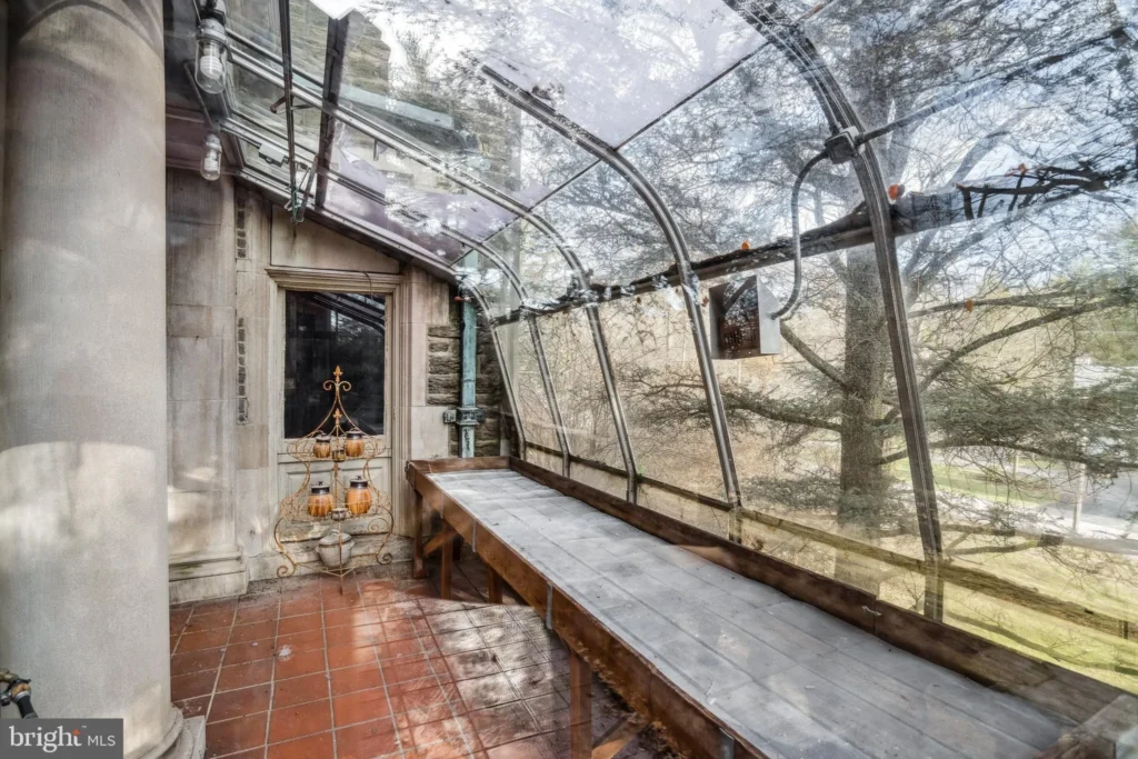 Across a vaulted hallway, the handsome wood-panelled library is anchored by a wall of floor-to-ceiling built-ins. A large bay window and corner marble fireplace, make it the perfect spot to relax or curl up with a good book. Through a pocket door, the elegant, sun washed music room is crowned by a beautiful brass chandelier. Natural light pours in through a suite of south facing French doors connecting to the spacious outdoor terrace and greenhouse.