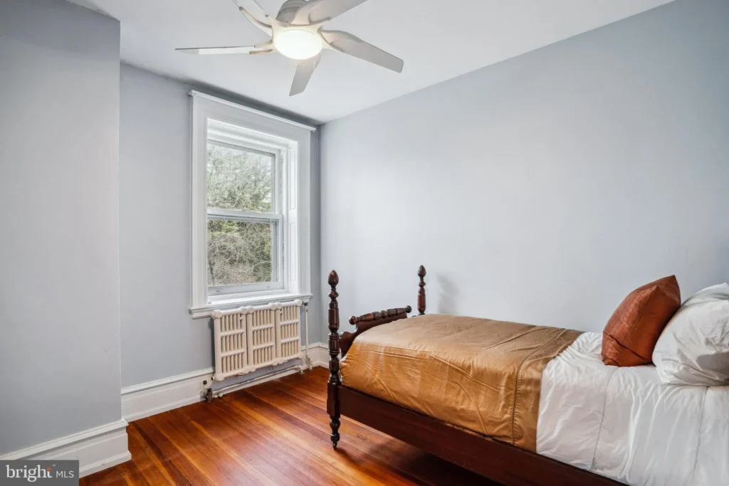 The south facing bedroom has a Jefferson window that leads out to a terrace that tops the covered porch while the east bedroom has a large bay window with built in seating that overlooks the Rex Street lawn. There are two smaller bedrooms at the north end of the house that are served by a hall bath.