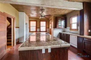 The kitchen, while functional, presents a canvas for restoration, ready to be transformed into a space that honors its heritage while providing modern convenience. The high ceilings, thick trim, and generous proportions make every renovation possibility feel rich with potential.
