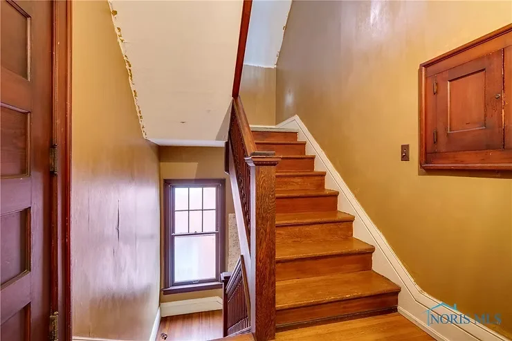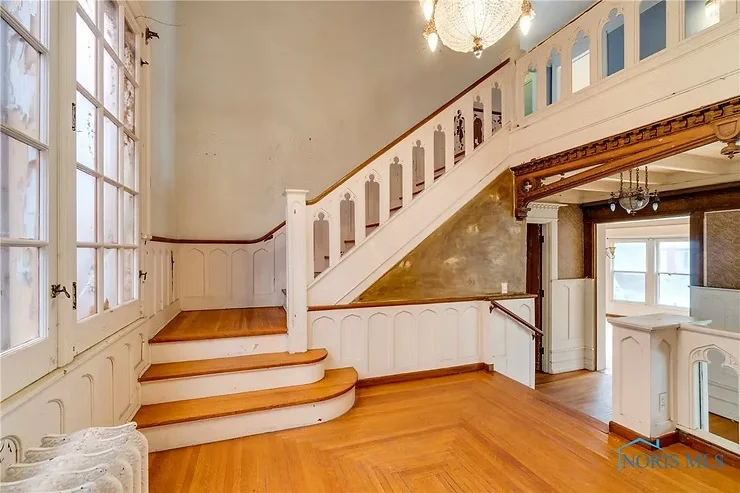Inside, the mansion continues to impress. The foyer opens to soaring ceilings and an ornate staircase that immediately captures the imagination. Original hardwood floors stretch across expansive rooms, their patina reflecting decades of life and laughter.