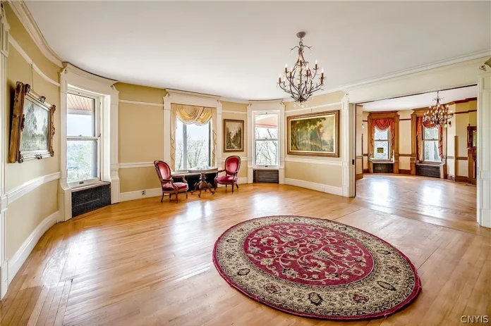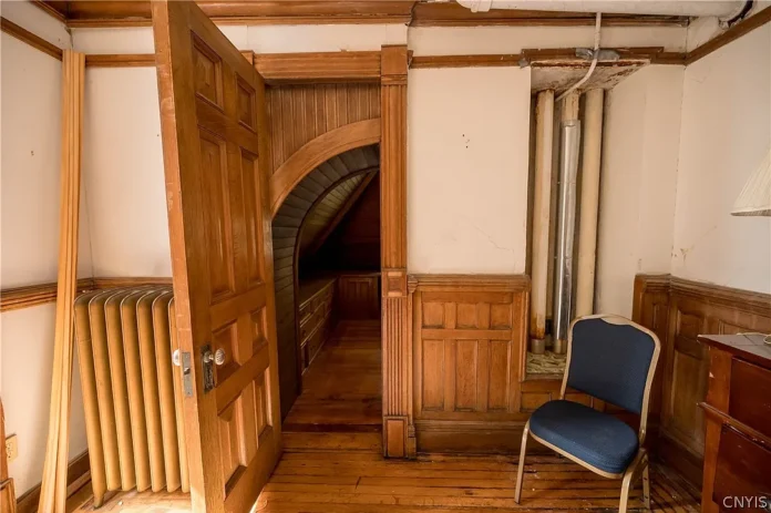 The ornate, hand-carved millwork is a testament to an era when artisanship was paramount.